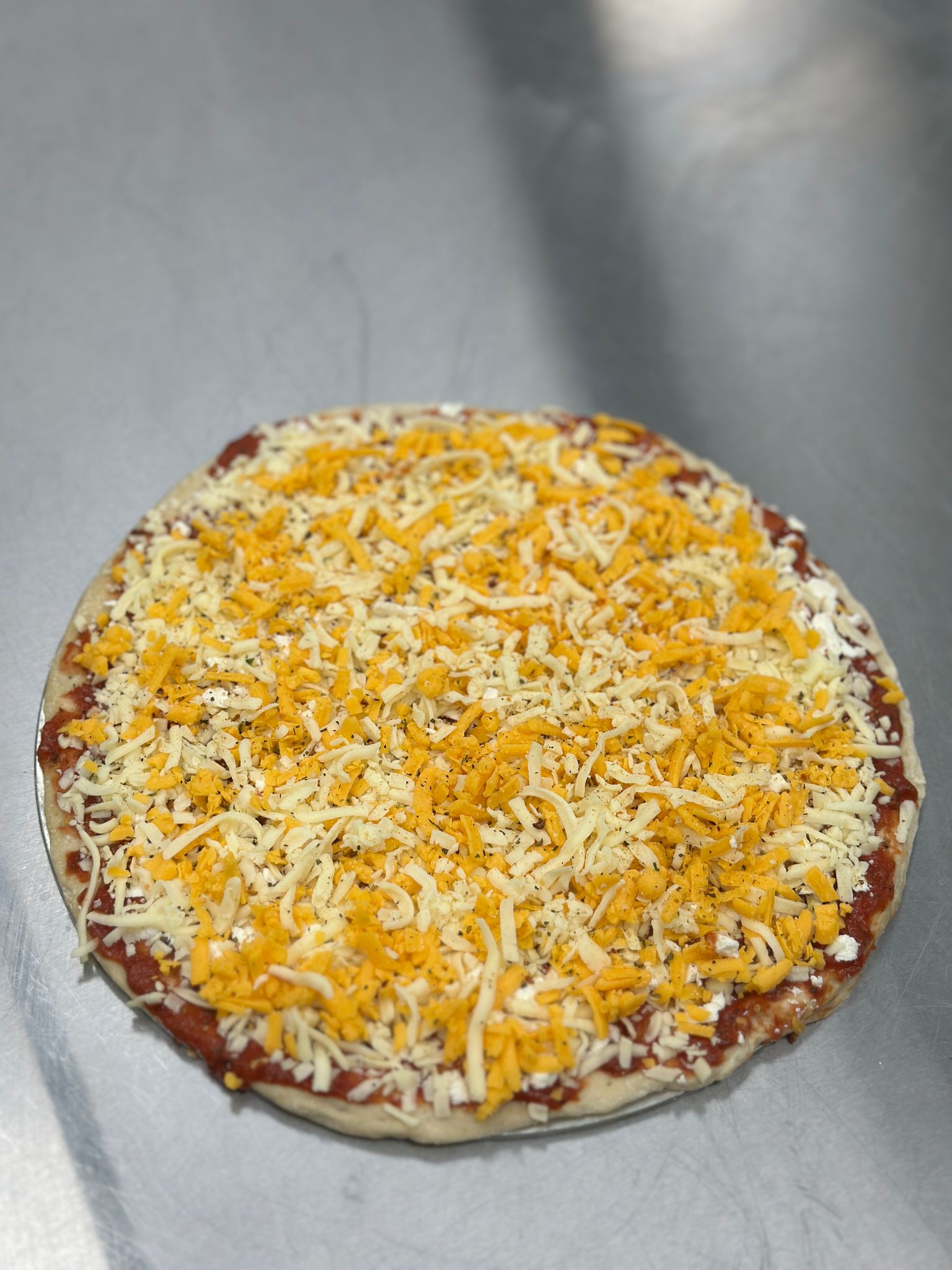pizza sauce, and shredded mozzarella cheese, with optional additions like parmesan, garlic, herbs, and olive oil.