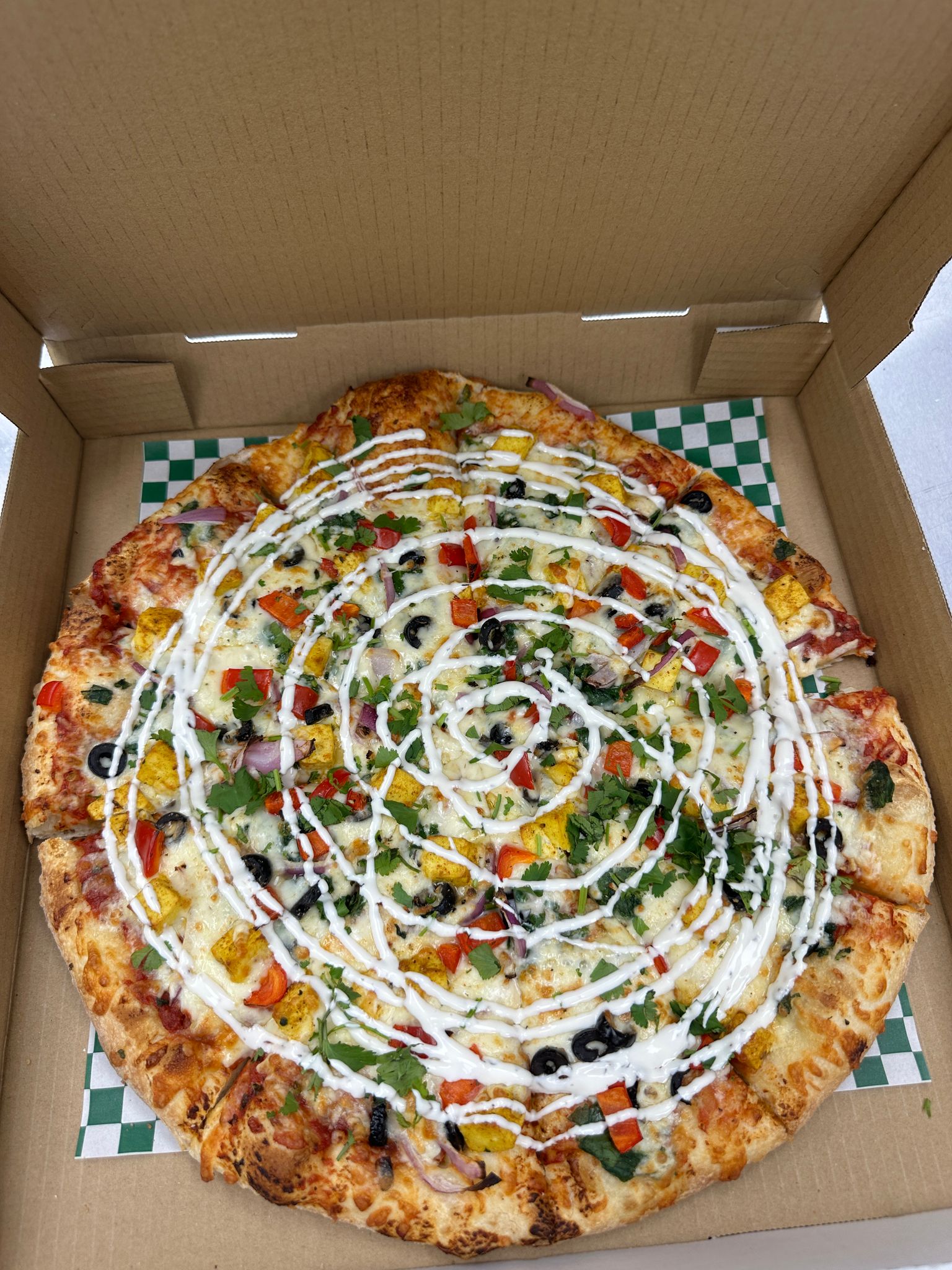 Tandoor Paneer, Onions, Tomatoes, Mushroom, Pineapple, Pizza Sauce, Mozzarella cheese.